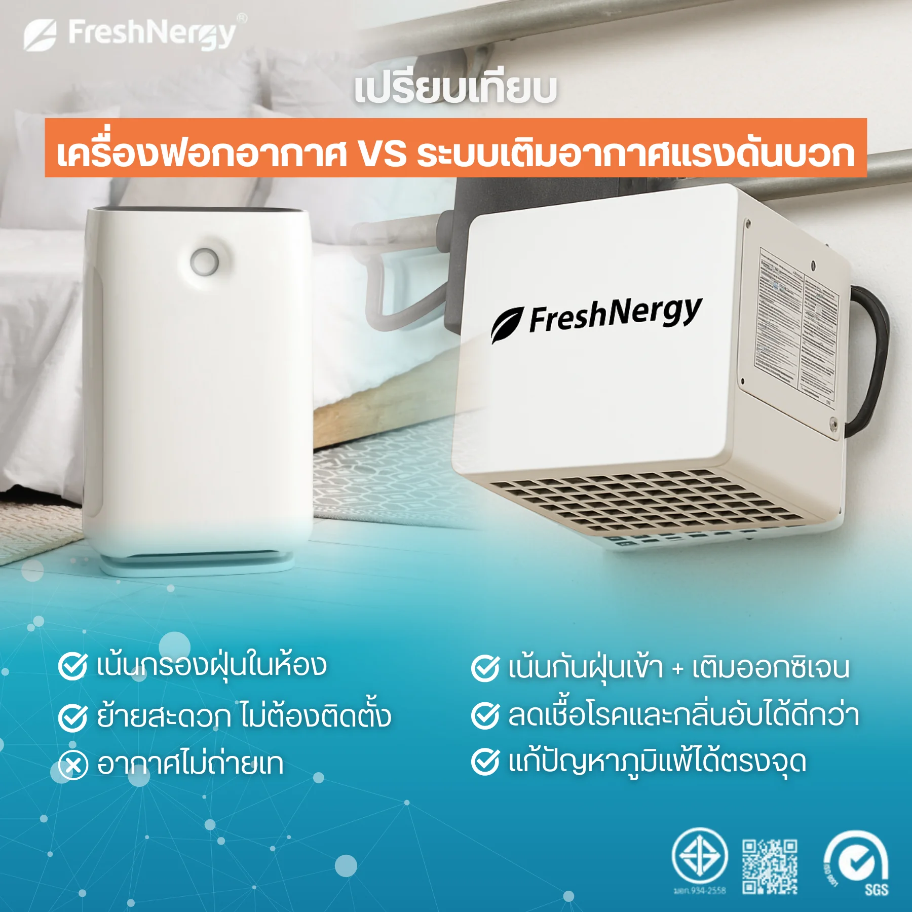 หากกำลังมองหา เครื่องอัดอากาศแรงดันบวก ยี่ห้อไหนดี ที่คุ้มค่ากับงบประมาณและมีมาตรฐานสูง Freshnergy คือแบรนด์ที่ตอบโจทย์นี้ได้อย่างตรงจุด ด้วยนวัตกรรมที่ออกแบบมาเพื่อเปลี่ยนบ้านให้เป็นห้องแรงดันบวกประสิทธิภาพสูง ทำหน้าที่ดึงอากาศบริสุทธิ์ผ่านแผ่นกรอง HEPA เกรดพรีเมียมเข้ามาภายในบ้าน พร้อมระบบการทำงานที่เงียบแต่ทรงพลัง ช่วยป้องกันไม่ให้ฝุ่น PM2.5 หรือมลพิษภายนอกเล็ดลอดเข้ามาได้แม้แต่นิดเดียว