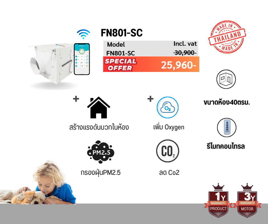 เครื่องเติมอากาศอัจฉริยะ Freshnergy รุ่น FN801-SC มาพร้อมระบบกรอง 3 ชั้น (Pre-Filter, HEPA H13, และ Carbon Filter) ที่สามารถกำจัดฝุ่น PM2.5, แบคทีเรีย, กลิ่นไม่พึงประสงค์ และไวรัสต่าง ๆ ได้อย่างมีประสิทธิภาพ เหมาะสำหรับผู้ที่ต้องการอากาศบริสุทธิ์ในบ้าน คอนโด ออฟฟิศ หรือคลินิก ความพิเศษของเครื่องนี้คือสามารถติดตั้งได้ทั้งแบบแขวนและฝังฝ้า ประหยัดพื้นที่ รองรับการควบคุมผ่านแอปพลิเคชัน และรีโมตคอนโทรล เหมาะสำหรับผู้ที่มองหาเครื่องฟอกอากาศสำหรับผู้เป็นภูมิแพ้ หรือในพื้นที่ที่มีมลพิษสูง
